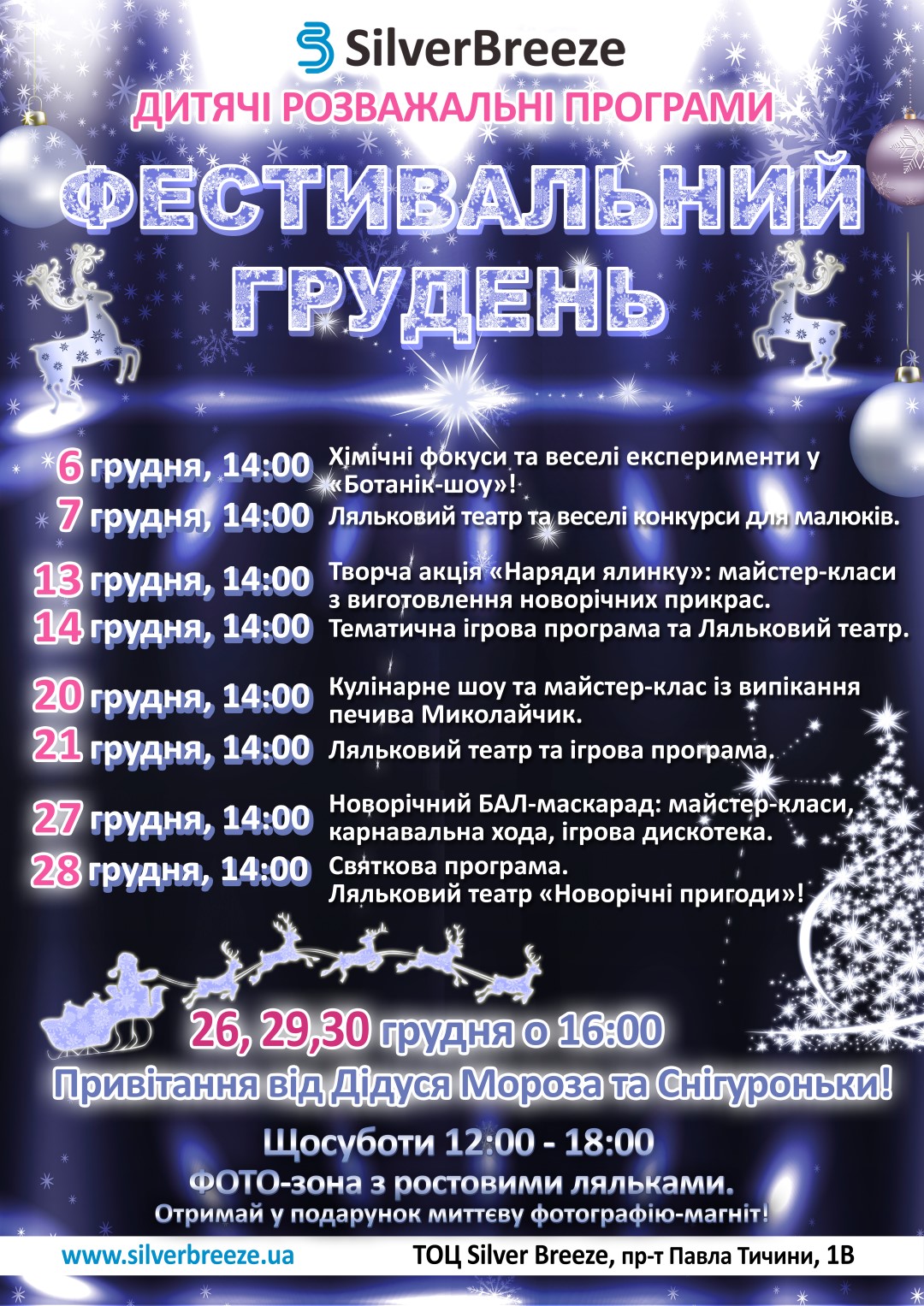 Веселі конкурси, майстер-класи, ігрові дискотеки та привітання від Дідуся Мороза та Снігуроньки!